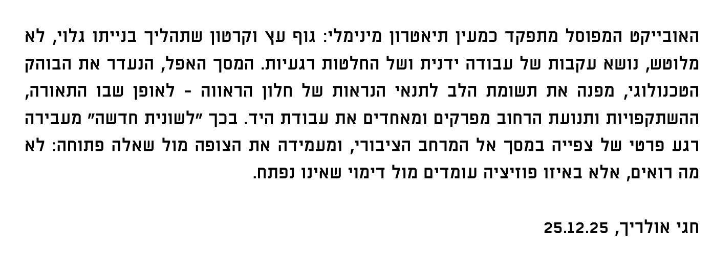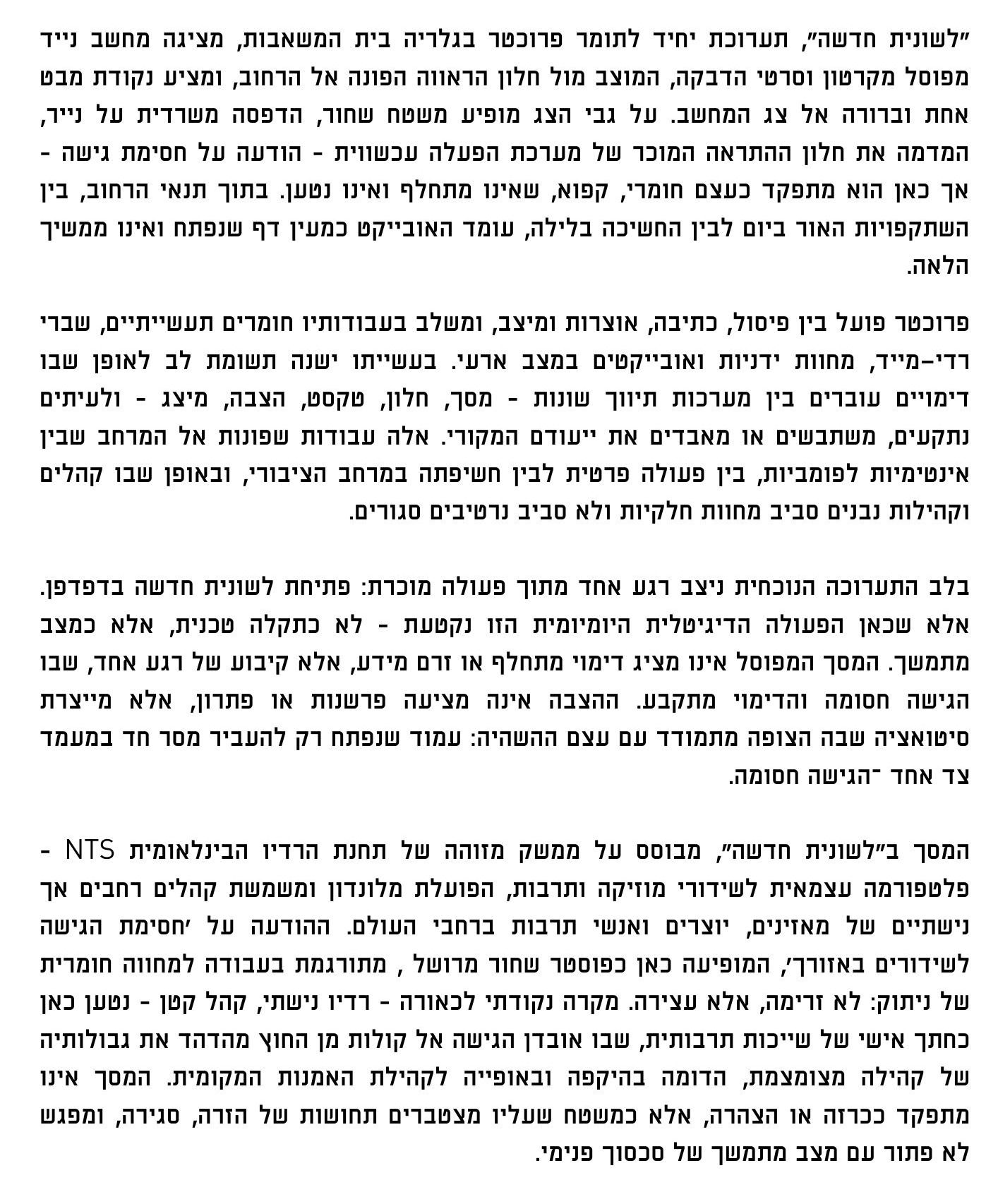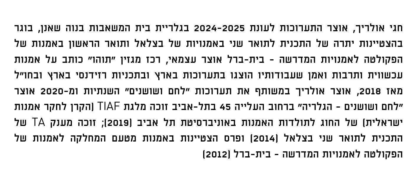 עקבו אחרינו באינסטגרם @the.pump.house.gallery ובעמוד של מרכז קהילתי הגר"א באתר העירוני. נגישות: התערוכה מוצבת בגובה הרחוב. פעילויות המתקיימות במקום נגישות אף הן באותו האופן
